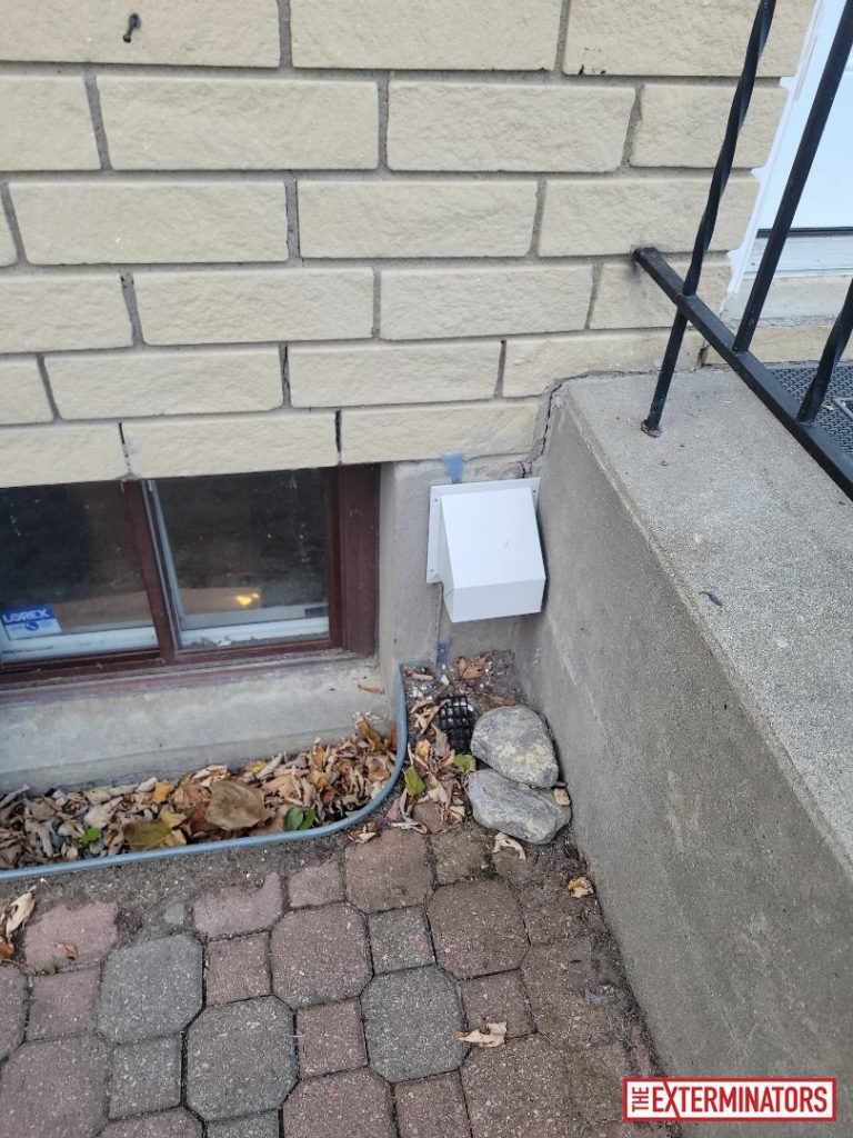 An exterior rat treatment program was implemented during Visit 1. Two large tamper-resistant bait stations were installed around the perimeter in strategic locations to target exterior rat activity.